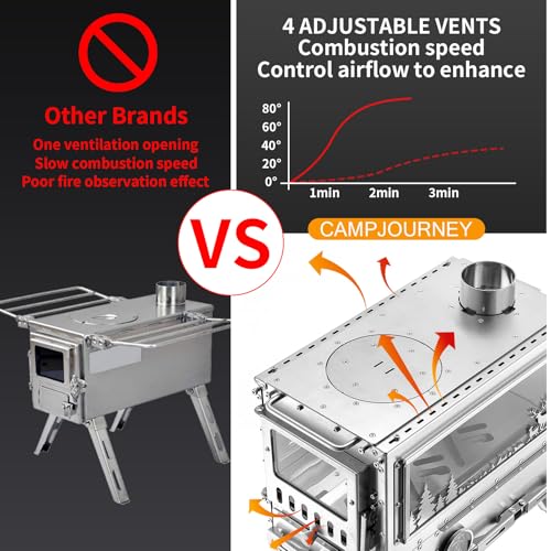 HIGH-QUALITY MATERIALS: The CAMPJOURNEY M6 Heavy-Duty Wood Burning Stove is made of full 304 stainless steel, weight is 50.7 pounds, precision-machined with CNC technology and hand-polished. The stove body is 1.5mm thick, while the top is double-layered at 4.5mm, ensuring durability and adaptability to extreme environments. This construction guarantees safe use and makes it a reliable choice for long-term use.