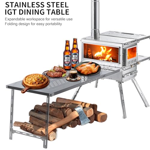 Specification: Wood Burning Stove with Oven & Table for Tents, Stainless Steel Portable Hot Tent Stove, Chimney Pipes, Ideal for Outdoor, Camping, Hunting, Ice Fishing, M6 Silver
