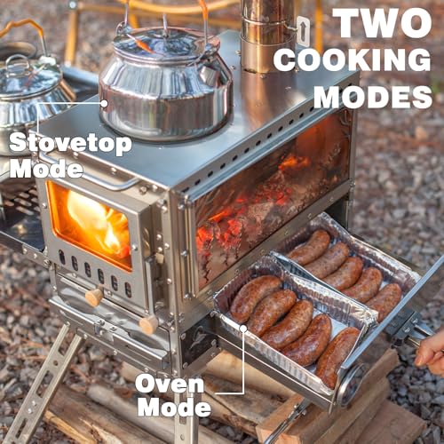 OVEN DESIGN: This portable wood burning stove features an oven with a thermometer, suitable for cooking a variety of foods. The thermometer displays the temperature and cooking status in real-time. The top plate is removable, allowing for boiling water, making coffee, or frying steaks, offering multifunctional convenience.