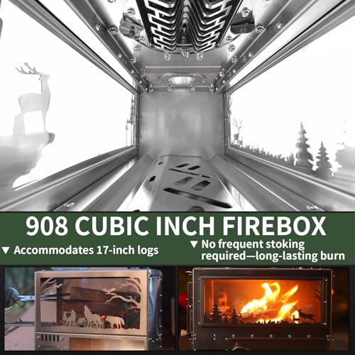 EASY TO OPERATE AND VENTILATE: The wood burning stove is easy to operate with a one-touch door switch and a adjustable ventilation system to control the flame. Top air intake holes enhance oxygen supply, promoting combustion. The spacious interior ensures high heating efficiency, making it suitable for winter camping.