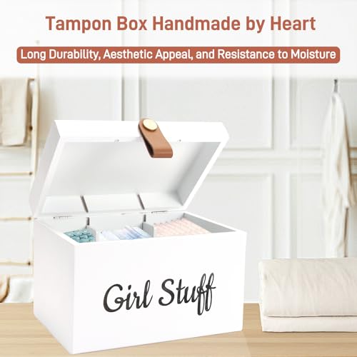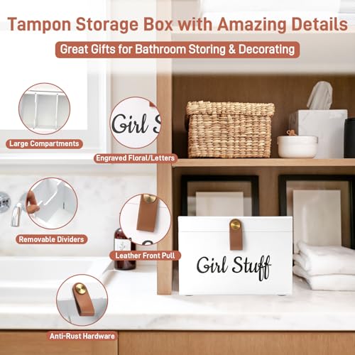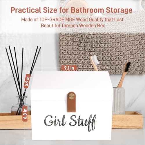Specification: Wooden Girl Stuff Tampon Holder Box with Lid and Copper Leather Pull, Modern Bathroom Decorative Box for Feminine Product Storage and Accessories such as Tampons, Cotton Balls, Wipes, Gifts for Women