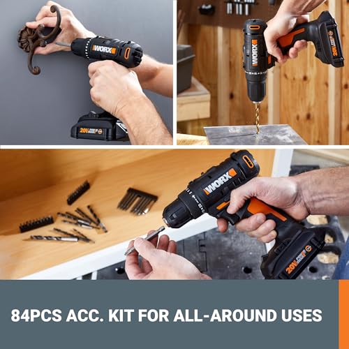 Worx 20V Cordless Drill Driver, 84pc Accessory Kit, Variable 2-Speed, 265 In-Lbs Torque, 20+1 Clutch, Lightweight, Compact, 3/8-Inch Keyless Chuck – Battery & Charger Included