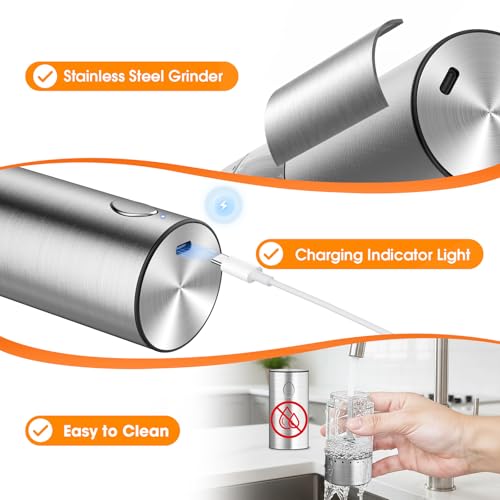 Long-Lasting & Rechargeable: Crafted from sturdy stainless steel for long-term use. A single charge supports 180 grinds, covering daily uses for 30+ days. An LED light at the charging port indicates charging status and shuts off once fully charged