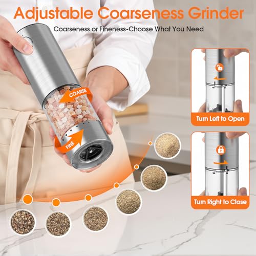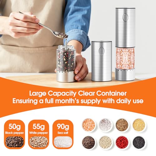 Specification: WOWBOX Electric Salt and Pepper Grinder Set 2 PCS, Stainless Steel Automatic Coarseness, Rechargeable Salt and Pepper Shakers, 95 L Large Capacity Multifunctional Pepper Mill, for Kitchen