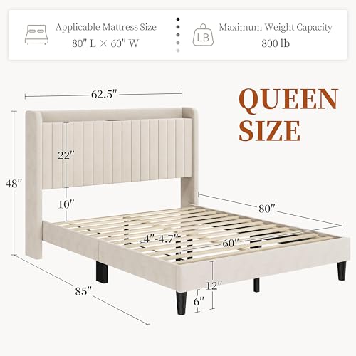 Specification: Yaheetech Queen Bed Frame with USB Charging Station and Storage Shelf/Upholstered Headboard Platform Bed with Wing Side/Wooden Slats Support/Noise Free/No Box Spring Needed/Easy Assembly, Beige