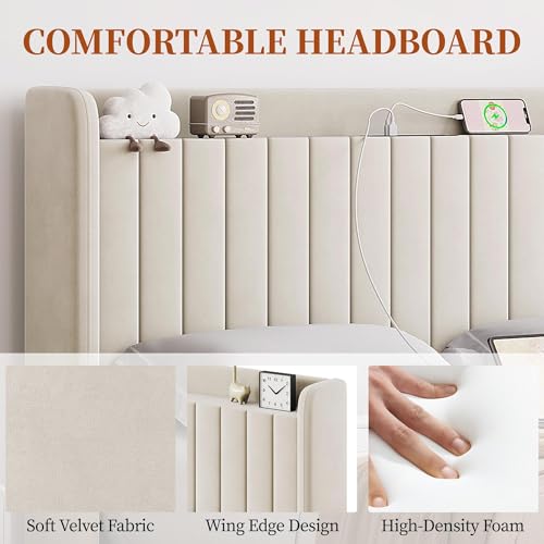 Yaheetech Queen Bed Frame with USB Charging Station and Storage Shelf/Upholstered Headboard Platform Bed with Wing Side/Wooden Slats Support/Noise Free/No Box Spring Needed/Easy Assembly, Beige