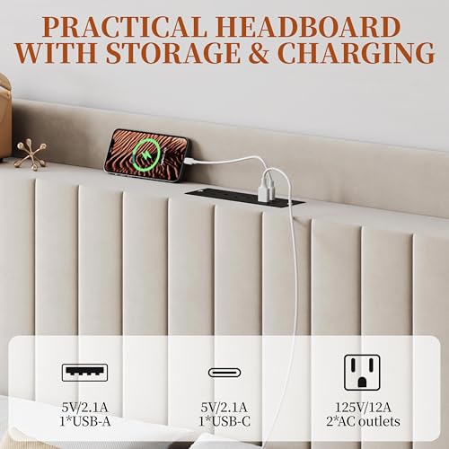 4 Charging Ports Built-In: This queen bed frame with headboard features a built-in power strip with two AC outlets and two USB ports, allowing you to effortlessly charge your phone, tablet, power bank, headphones, or desk lamp from the comfort of your bed