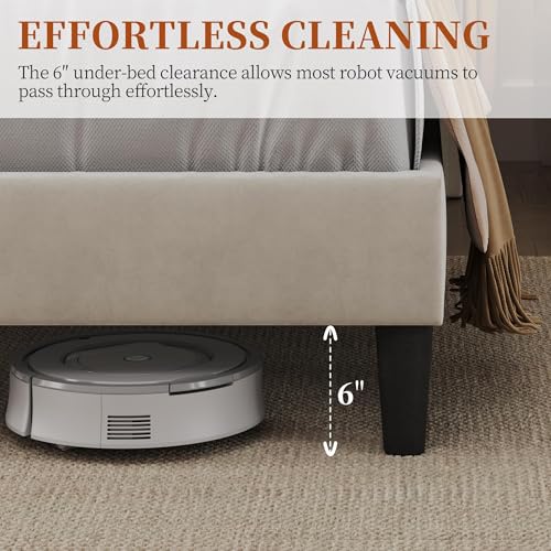 Effortless Cleaning: With an under-bed space of 6″, future dust cleaning will be a breeze. Cleaning robots can pass through freely, making the task of cleaning this beige bed frame queen with wooden slats effortless for you