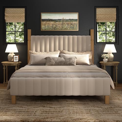 Yechen Queen Bed Frame with Headboard, Wood Bed Frame with Solid Wood Posts, No Box Spring Needed, Beige Linen