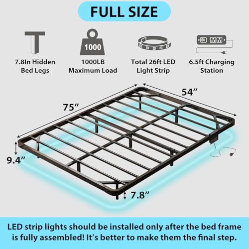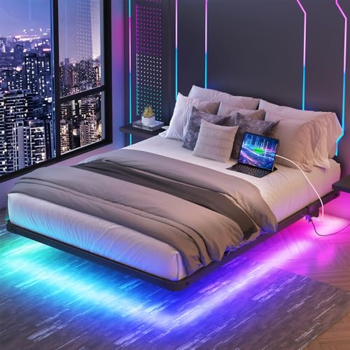Specification: YGEOMER Full Size Floating Bed Frame with Charging Station, Modern Metal Platform Bed Frame with LED Light, Easy Assembly, Black