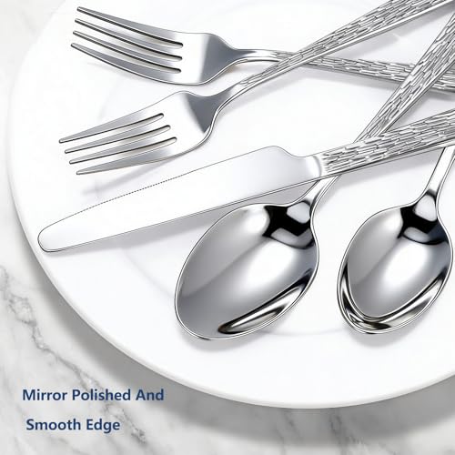 Yoehka 60-Piece Hammered Silverware Set for 12, Stainless Steel Flatware Set with Tree Pattern Handles, Mirror Polished Cutlery/Utensils Set for Home, Restaurant, Hotel, Dishwasher safe