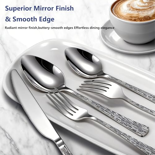 Elegant Design with Mirror Polishing: Crafted in a timeless style, this utensil sets showcase refined silhouettes and graceful curves, making it an ideal match for any flatware collection. Each piece handle features a beautifully textured tree pattern hammered design, giving your tableware a luxurious yet earthy aesthetic. The mirror polished surface catches the light beautifully, elevating everyday meals or formal gatherings