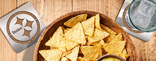 Save your table and show your pride with a 4-piece set of Pittsburgh Steelers Sportula Boasters. These heavy-duty stainless steel drink coasters sport a laser-cut Steelers logo and a strong cork backing. Great for fan caves and sports bars.