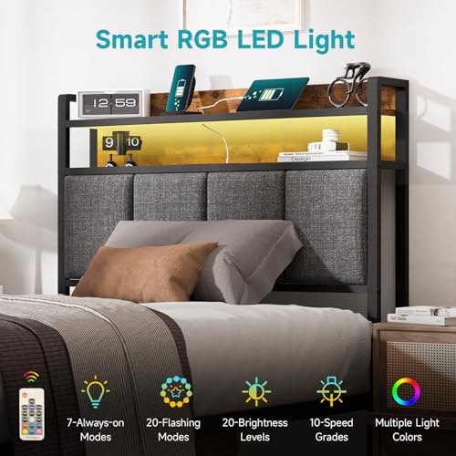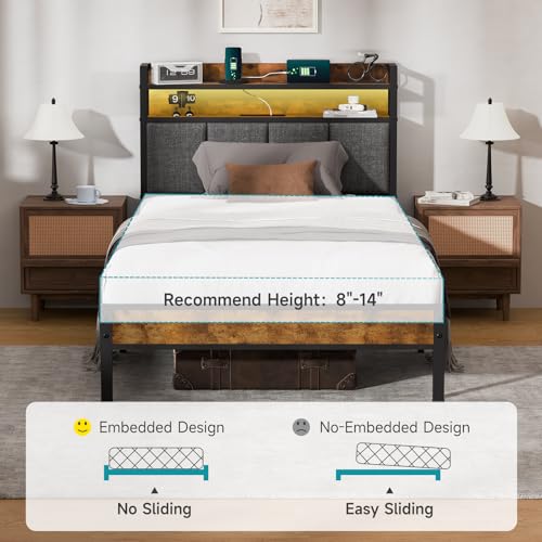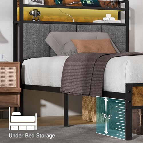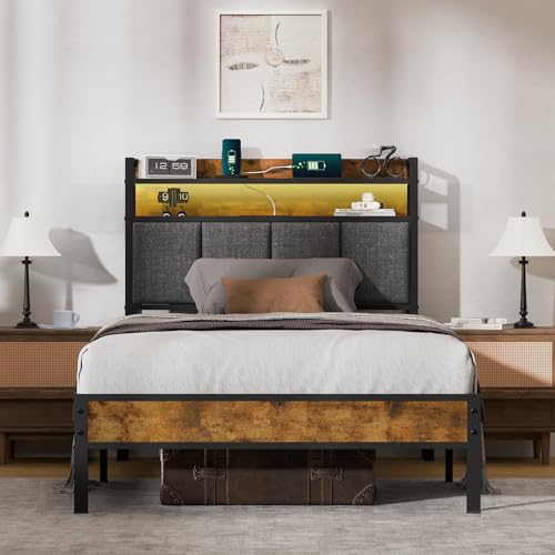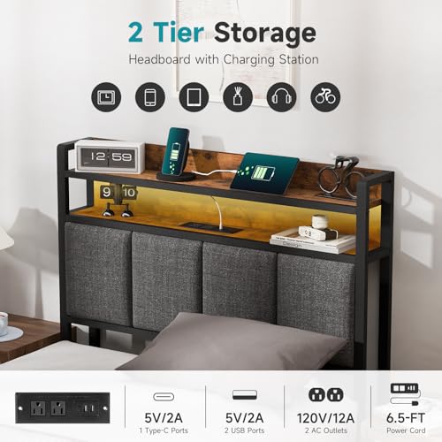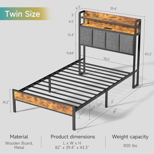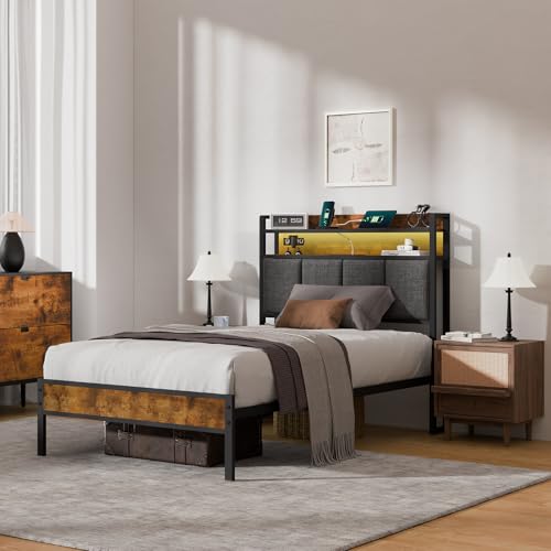 Specification: Z-hom Twin Bed Frames, Twin Bed Frame with 2-Tier Storage Upholstered Headboard, Metal Platform with USB Charging Station & LED Lights, Noise Free, No Box Spring Needed, Easy Assembly, Vintage Brown