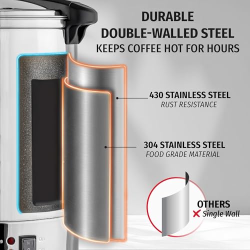 HEAVY-DUTY DESIGN: Our 100 cup coffee maker brewing commercial is constructed with double-wall insulator with a 0.41mm thick 430 stainless steel outer layer and a 0.41mm thick 304 stainless steel inner layer that is both engineered in retaining the heat longer than single wall models. This large coffee maker 100 cup has cool to touch handles which makes our coffee urn 100 cup easy to carry and a simple twist-lock lid that helps lessen accidental spillage.